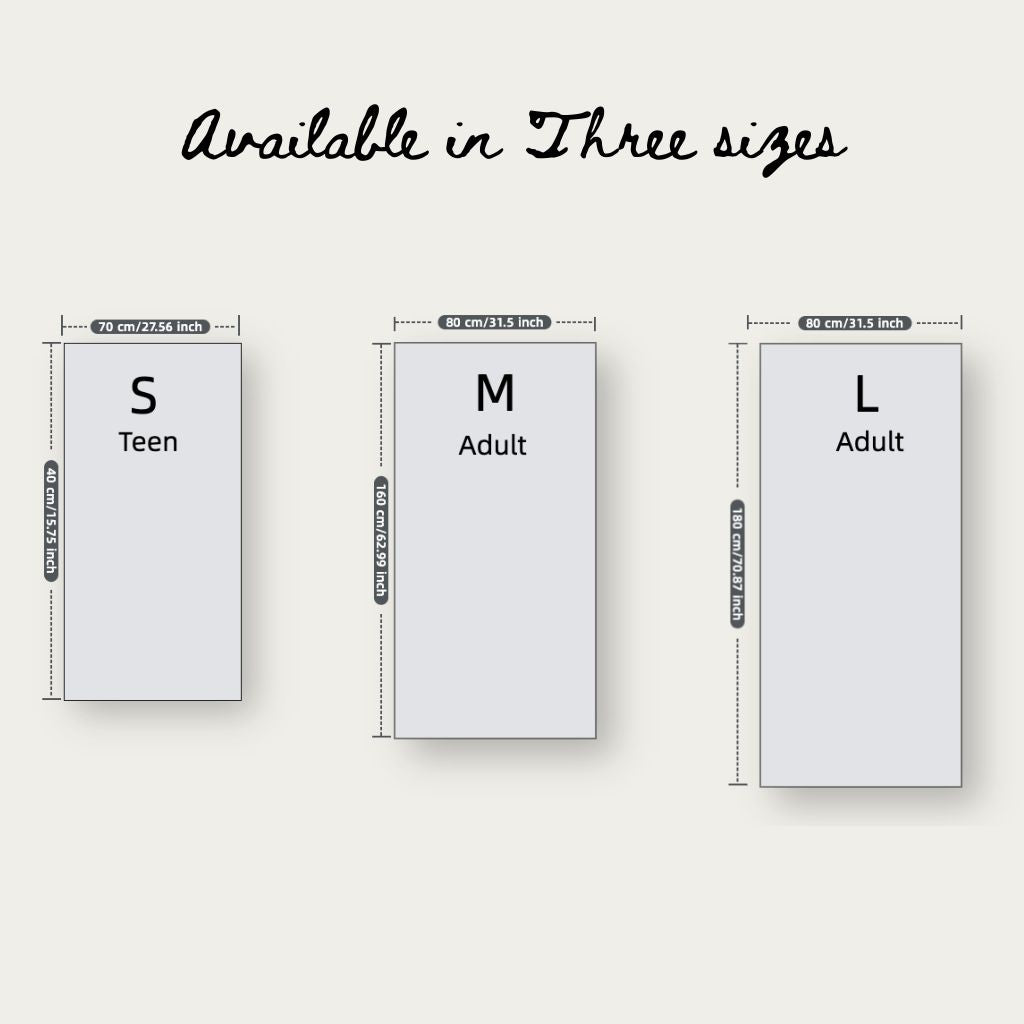 | Avaliable Sizes | S: 27.5" × 55" (70 × 140 cm) – Kids M: 31.5" × 63" (80 × 160 cm) – Standard Adult L: 31.5" × 71" (80 × 180 cm) – Oversized (*slight variations (±0.8") may occur.) |